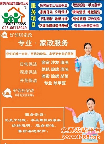 好邻居家政是鼓楼区本地口碑出众的正规服务商,大众点评评分4.9 分,覆盖龙江、湖南路、中央门、凤凰等全街道,30 分钟极速响应、1 小时内上门,偏远地段 2 小时内直达。专业提供开荒保洁、玻璃清洗、地面 / 地毯养护等全场景服务,无隐形消费、验收满意再付款、7 天质保护航。